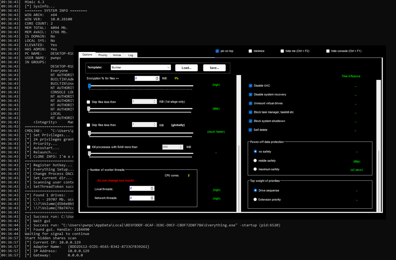 In this panel is possible to change the number of worker threads dedicated for encryption, choose which files to skip, self-delition, task-kill capabilities and more.