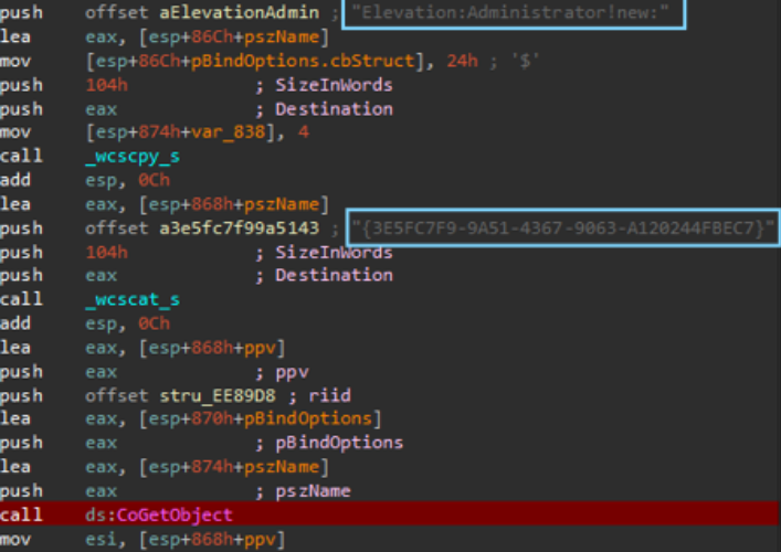 Its basically abusing a feature of Windows COM objects. This is a known technique for UAC bypass where the program abuse an auto elevated COM object like cmstplua com interface The call to CoGetObject take as an argument the entire moniker string: Elevation:Administrator!new:{3E5FC...} and return a pointer to the interface of the requested object. After this there is a call to ObjectStublessClient9, the 9 indicate the index inside the vtable of the interface ICMLuaUtil. We can do a little of reverse engineer of the vtable to understand what it does