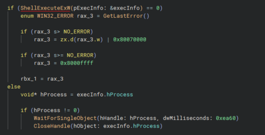 We can see that inside it call ShellExecuteExW(). You can say almost with certainty that the program is creating another elevated instance of itself abusing this elevated call