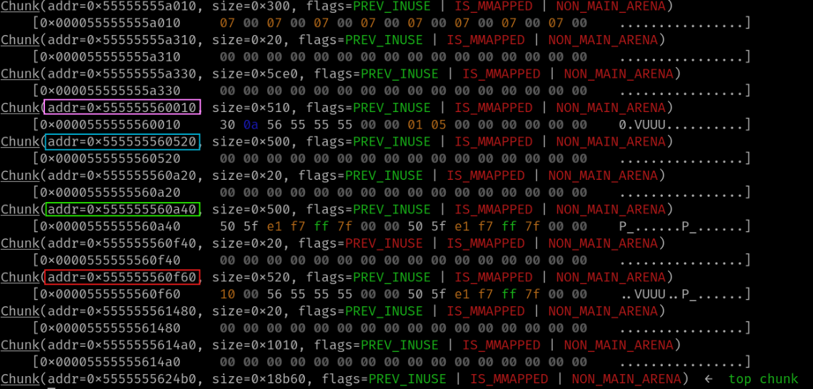Another things we probably want to use are chunk pointers, if we can modify the forward and backward pointers of a free chunk we can control the location of the next allocation to gain arbitrary write