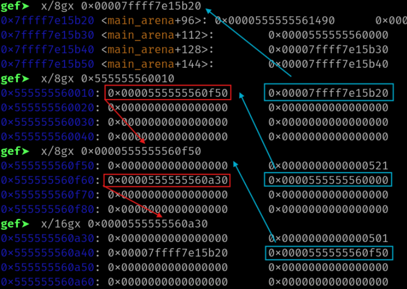Now the next step is to manipulate the residual pointers in order to bypass safe unlinking mitigation later
