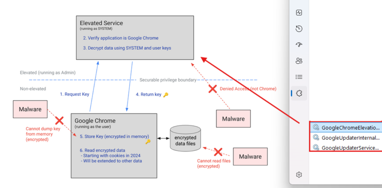 This ensure that only the elevated services can decrypt the stored data and only the browser process can request to decrypt the data.
