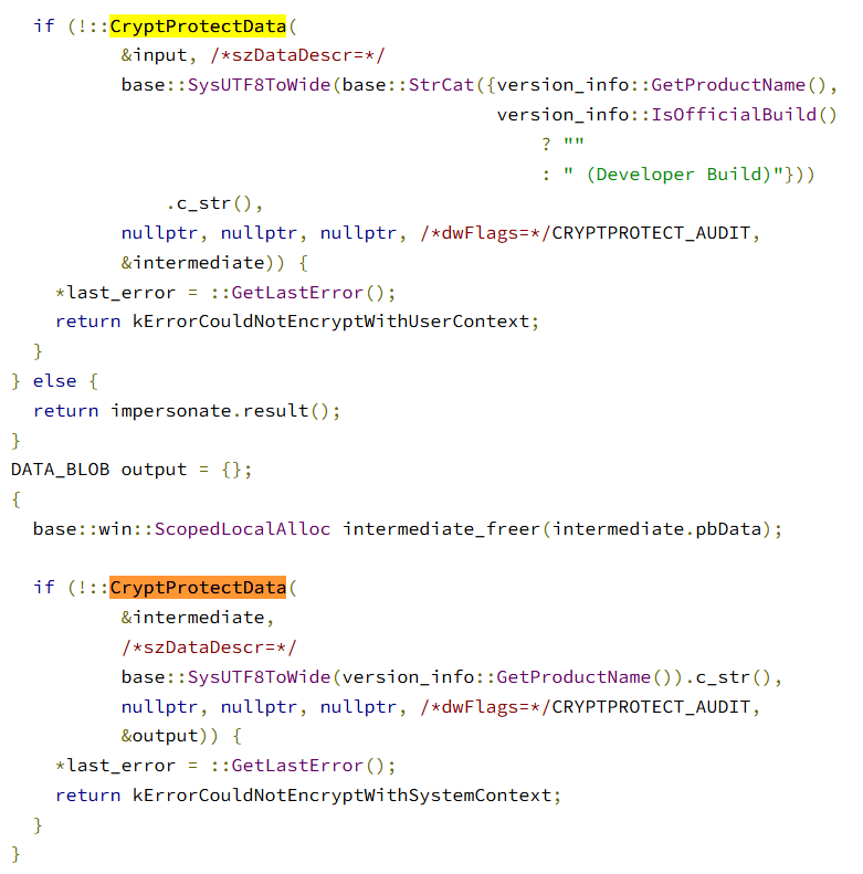 The decryption is what we have just said but in reverse + the path validation if specified. Everything is then stored inside \Local State file as os_crypt.app_bound_encrypted_key.