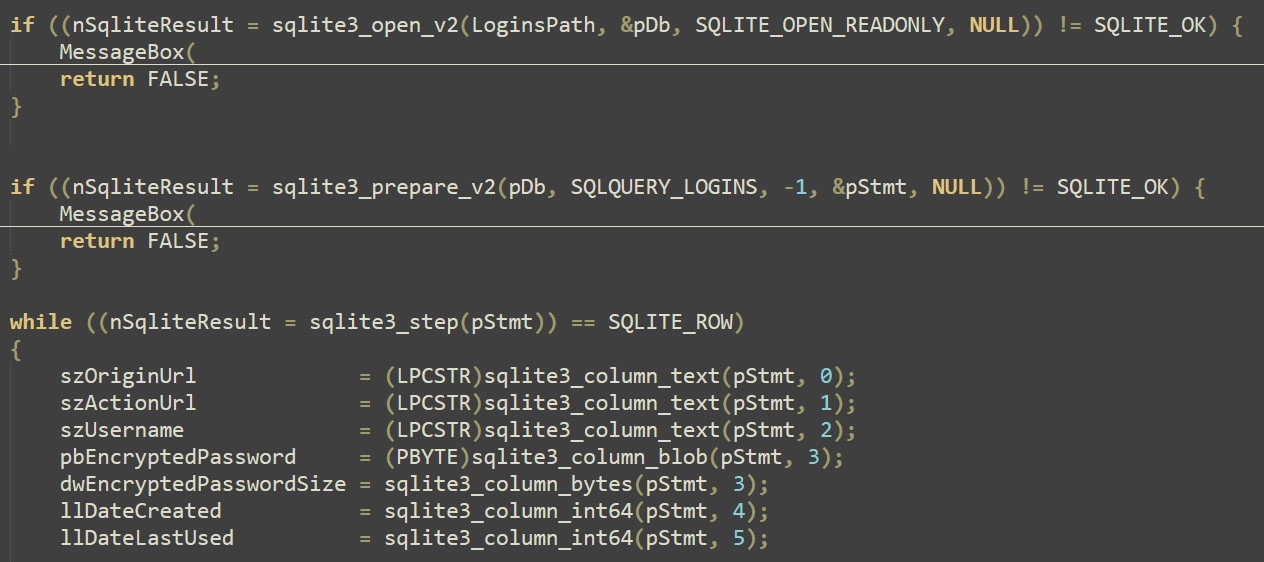 Browsers store sensitive data in AppData folder (%LOCALAPPDATA%\Google\Chrome\User Data\Default\) inside sqlite databases, accordingly we will need to interact with it trough the C code. For this you can just use the sqlite3.c and sqlite3.h of this repository.