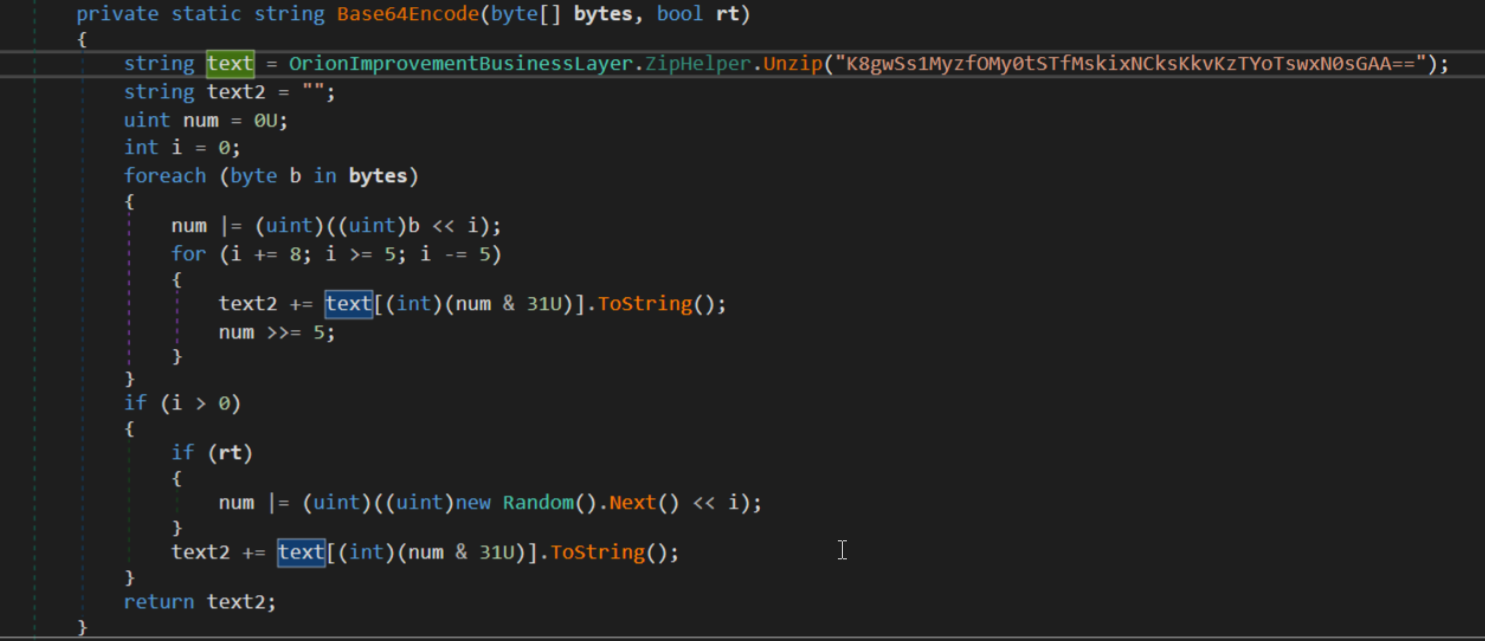 The last part of the generated subdomain is the encoded domain name of the machine defined in OrionImprovementBusinessLayer.CryptoHelper.dnStrLower